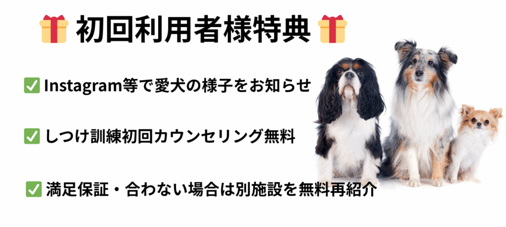 | 🐕 しつけ訓練(1回) | 3,300円〜 | 専門訓練士による個別レッスン |
